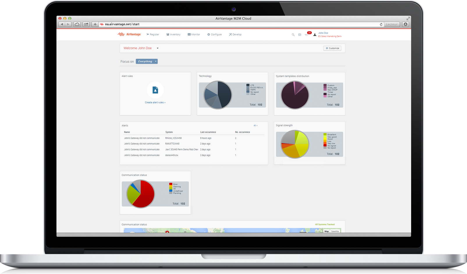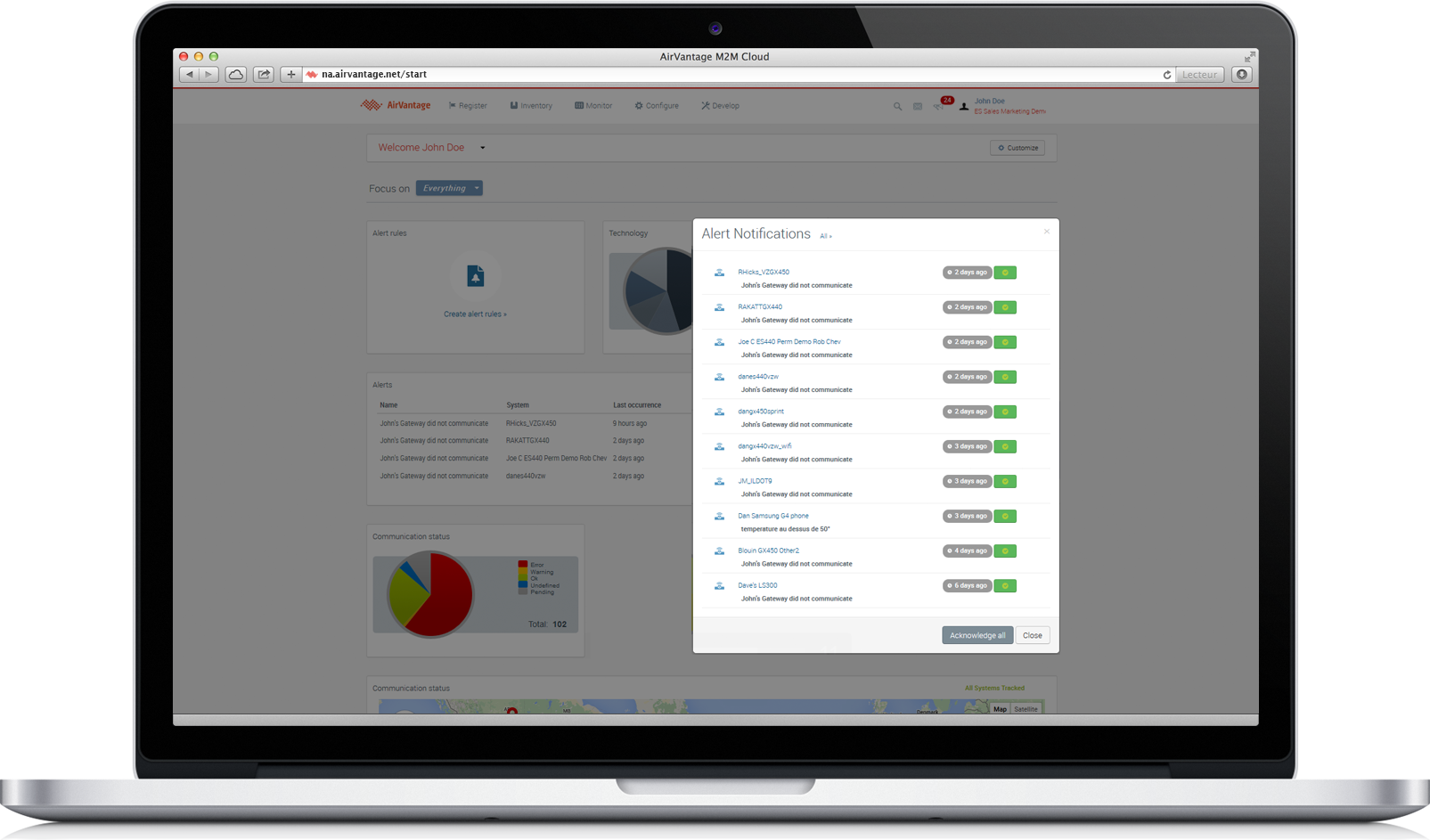 AirVantage provides a way for a user to build custom alert rules. Staff will be notified whenever devices go offline resulting in faster issue identification, less downtime, and fewer field trips.