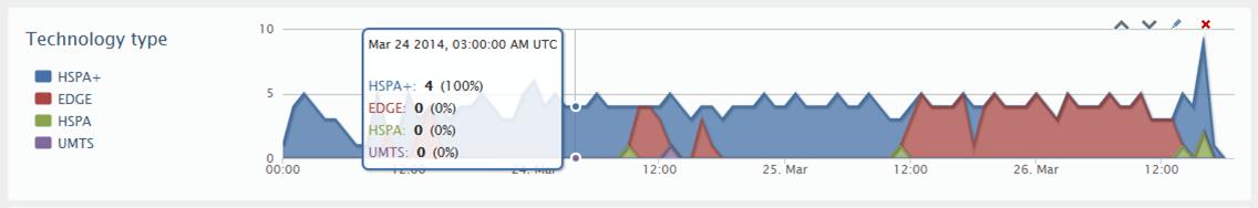 - A widget provides statistics about the evolution over time of the cellular technology reported by the device: LTE, HSPA, 3G or 2G. It will help to identify working conditions of your device on the field.