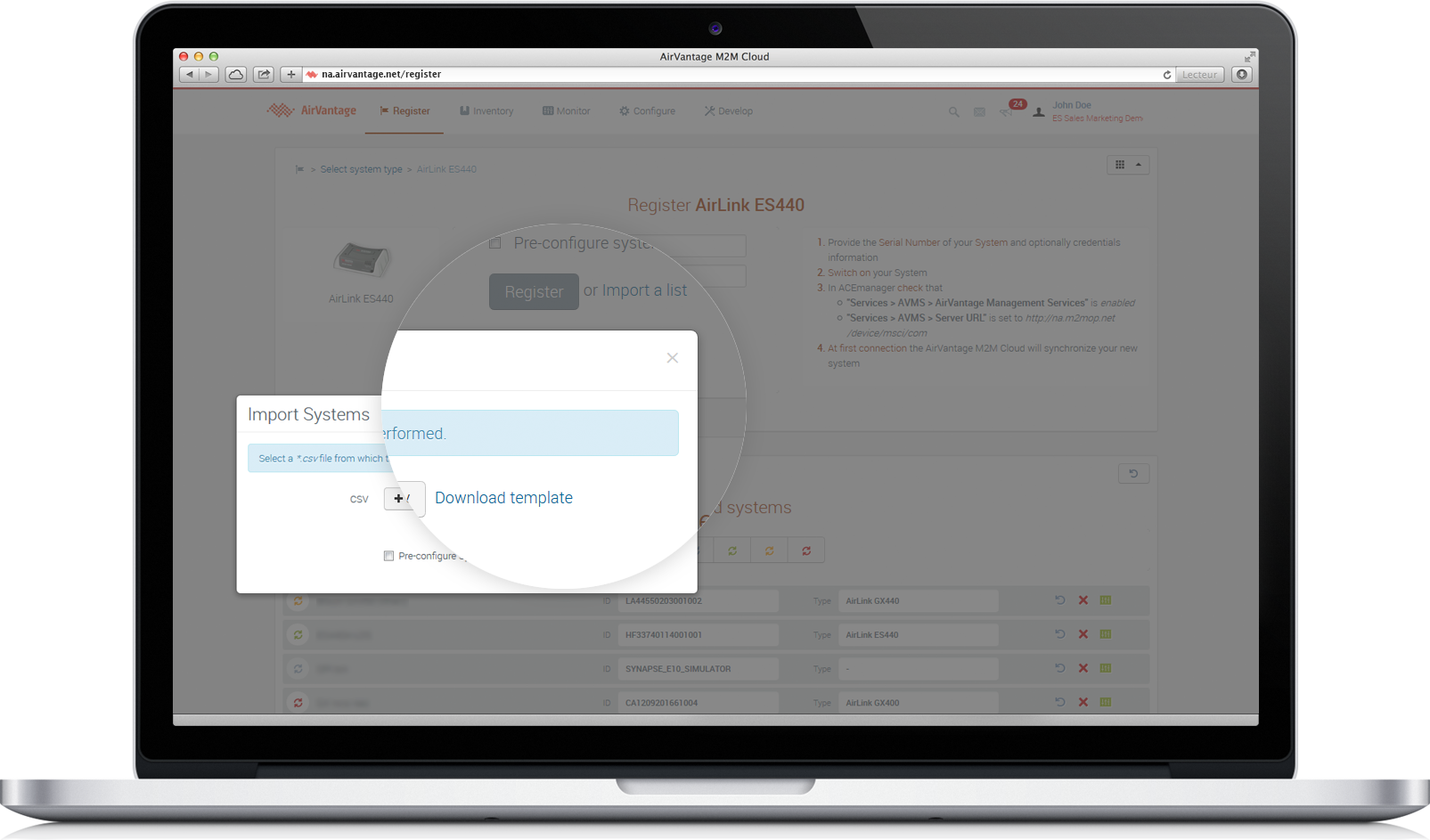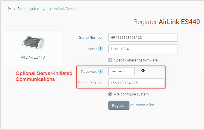 Note that you can only import the selected type of AirLink device with this action. In this example it is an ES440. If you have other device types, they will have to be registered separately.