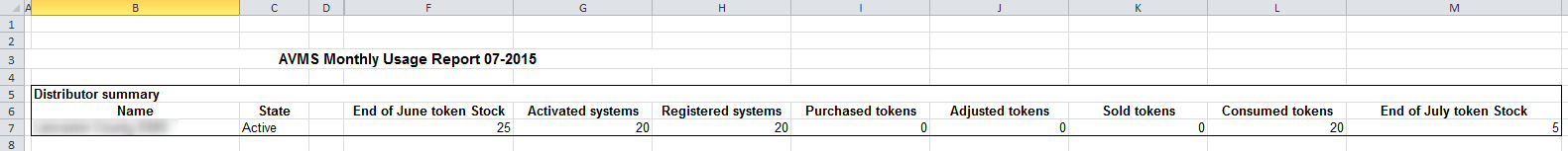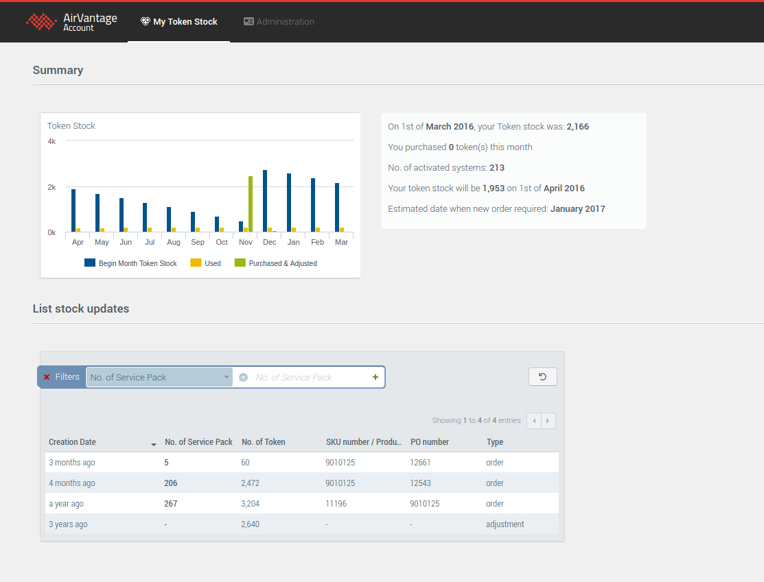 The number of activated systems shown is the peak number of systems activated within your company account for current month. It is updated once per day. This is the number that will be taken into account to decrement the token stock at end of the month. Your token purchases from Sierra are also considered when calculating the expected token stock.
