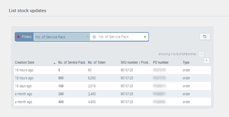This lets you track your fulfilled orders, with the ability to filter on order date, PO number, number of Service Packs purchased, or product reference. This table also shows stock adjustments. A stock adjustment is done without any link to a new purchase order, in case for example of a credit/debit note. Your stock is then updated accordingly.