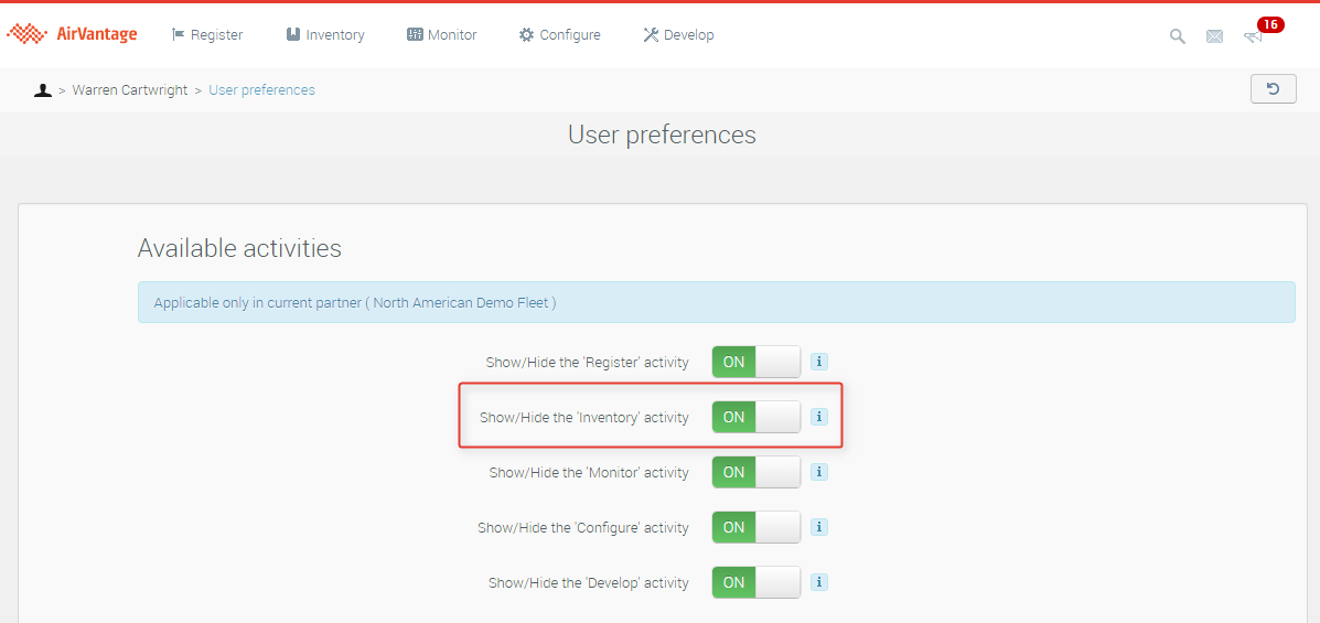 The Inventory section of AirVantage is not used frequently by ALMS users on a day-to-day basis. To help simplify the user experience in ALMS, we have hidden this section by default for most users. This article provides the instructions for re-activating this feature on a user-by-user basis.