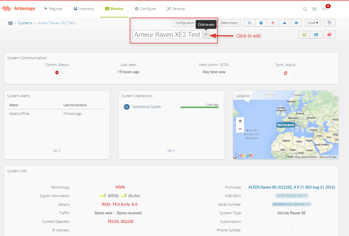 While registering or editing a system in AirVantage, you have the ability to set its name. This will set the name on the server side only. Please note that the ‘ALMS name’ in ACEmanager remains unaffected by this operation. Still if there is no default value for the ‘ALMS name’ on the device side, this will be sufficient.