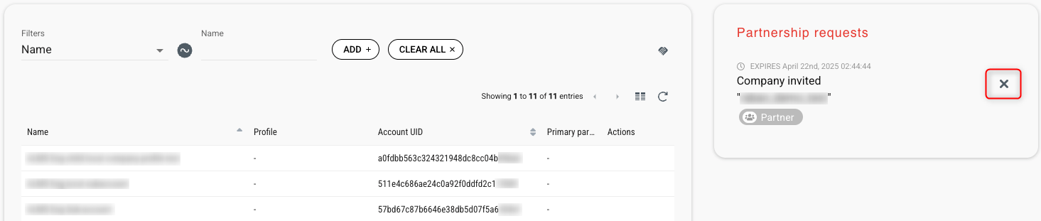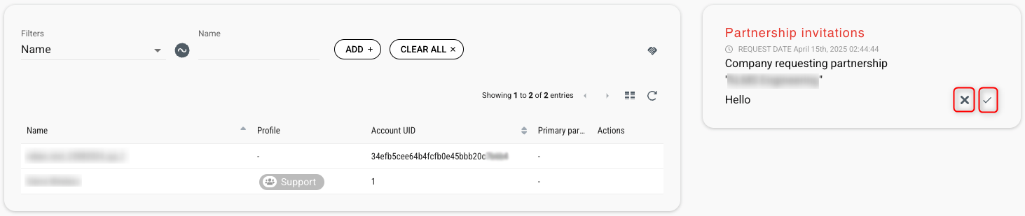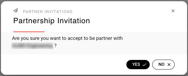On the Partners page, the invited company can accept (✓) or reject (×) the invitation.