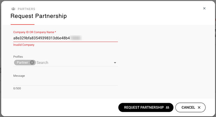 Note also that the partnership request is sent using the profile applied to your account (as shown above). If you require the same access to system entities and features between partners, then the company that accepts the partnership invitation will need to manually add a matching profile to their account (in this case, the Partner profile shown above).
