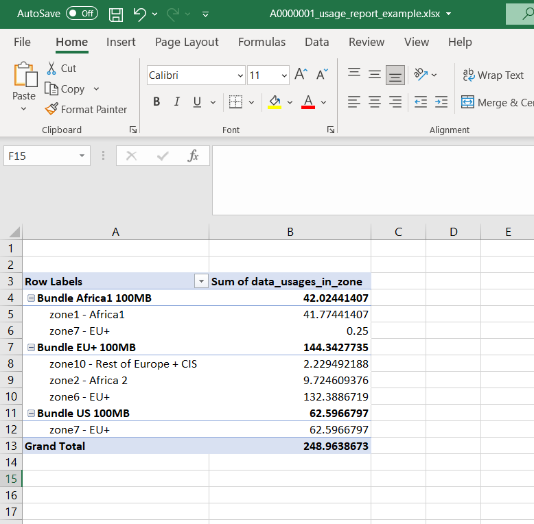 We’ve provided an example in the Excel file: Usage Report with Pivot examples . This excel file is based on a data usage report in which we’ve added 3 pivot tables for analysis of the data consumptions based on different aggregations: