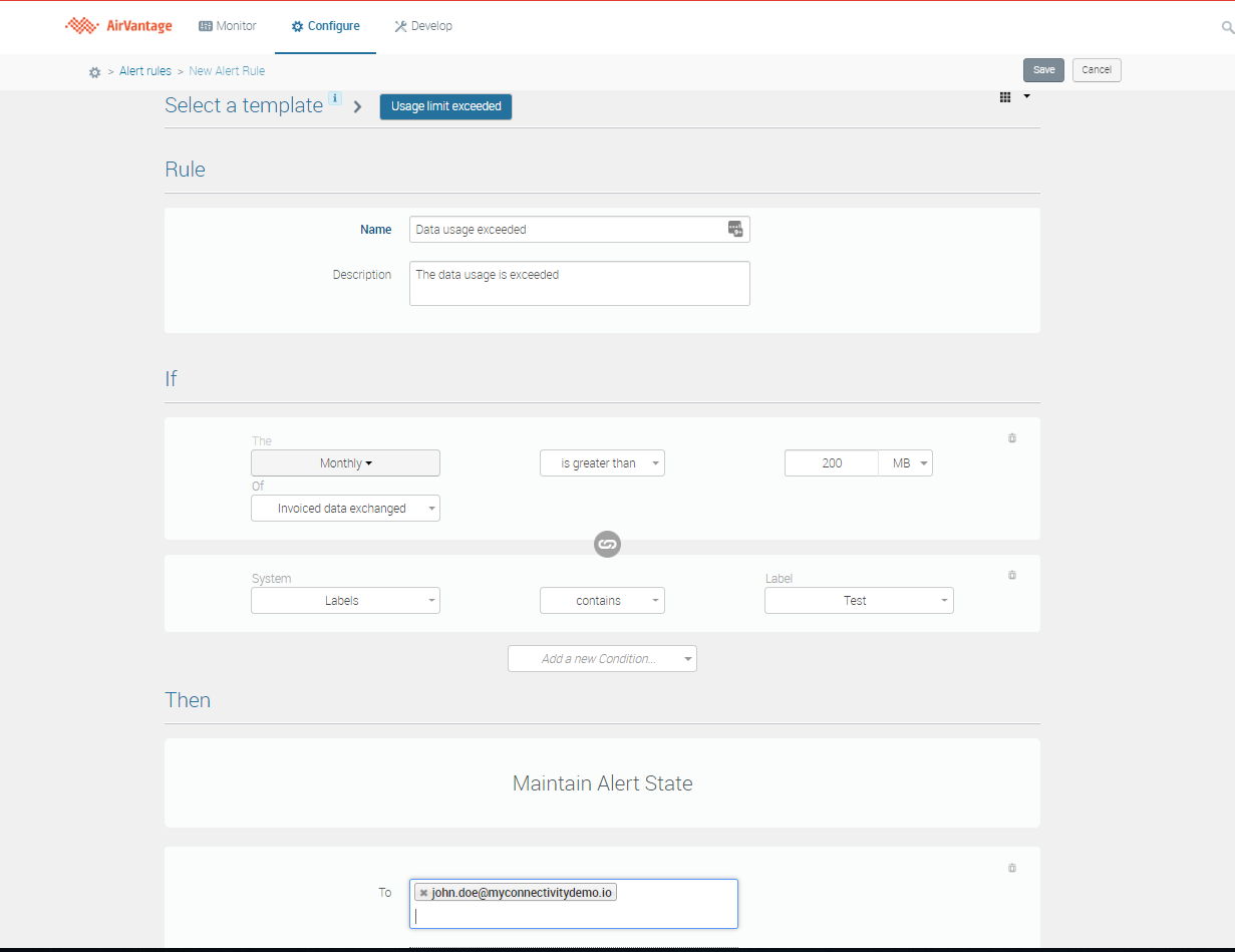 Below is another example that raises a “Monthly invoiced data usage exceeded” alert and sends an alert email when a system exceeds 200Mb data usage in the current month. Note that you can change the period on which the usage shall be aggregated and also the type of usage that is taken into consideration.