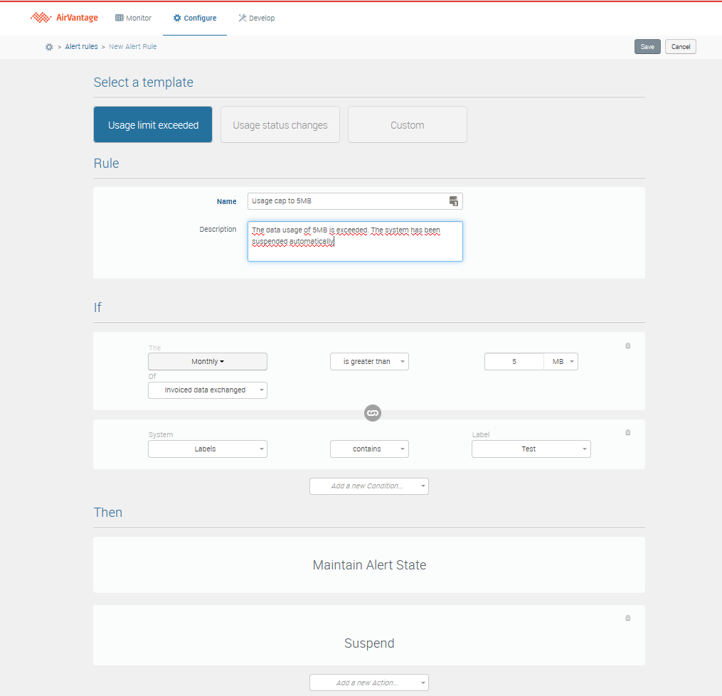For example if you want to suspend any system with label “Test” reaching 5MB of data consumption for current month, you have to setup your alert rule as below: