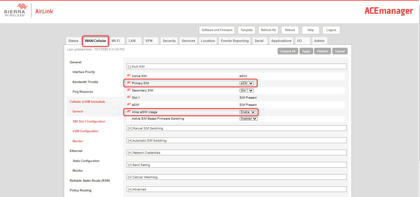 ALEOS 4.14 introduces automated support for switching to the eSIM on your Ready-to-Connect AirLink gateway (AirLink LX40, LX60 or RV55). To use the eSIM when running ALEOS 4.13, you need to make two changes to the configuration of the gateway in ACEmanager: