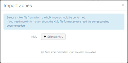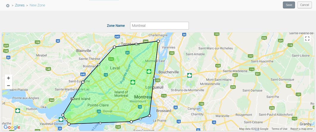 You can configure a zone yourself, or import a .KML file to define your zone. See Google’s KML Documentation Introduction for more information about KML.