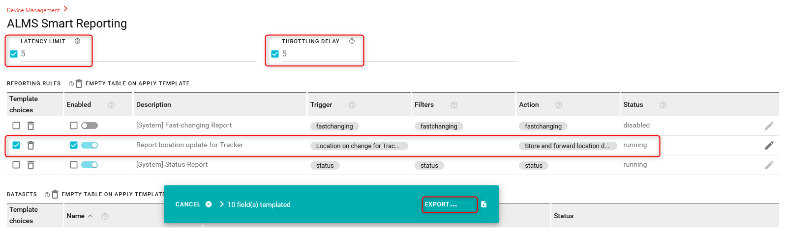 Select “Export to my ALMS account” to save the template, and give it a name such as “Smart_reporting_rule_for_Tracker”.