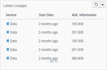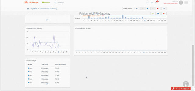 A new widget is available in the Monitor> System details to pinpoint the latest usages consumed on the selected SIM. The widget shows the type of usage along with the date at which the usage occured and the additional information related to the usage (duration, amount of data consumed, peer phone number depending on type of usage, visited network). If a session is still on-going it will be displayed as in progress.