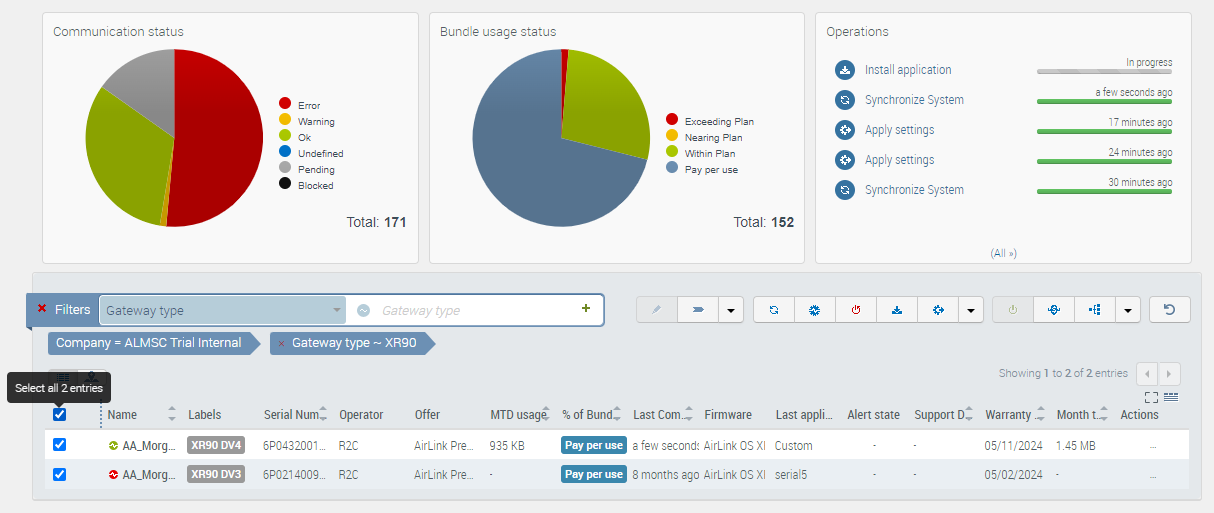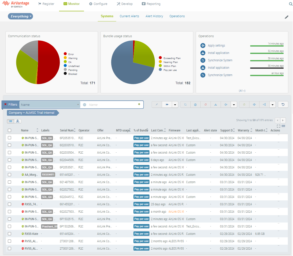 Semtech is pushing new firmware packages on AirVantage so you can keep your fleet up to date with the latest features and security patches. AirVantage also provides different widgets showing which firmware versions are actually deployed on your systems and the upgrade status compared to latest released firmware.