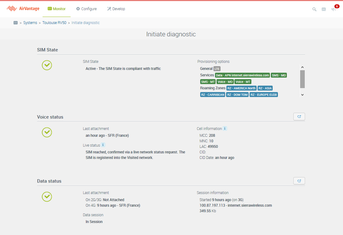 In case you need a sharp analysis on one SIM or facing some issues with your connectivity, AirVantage provides some functionalities for doing a deeper dive and diagnose your wireless connection.