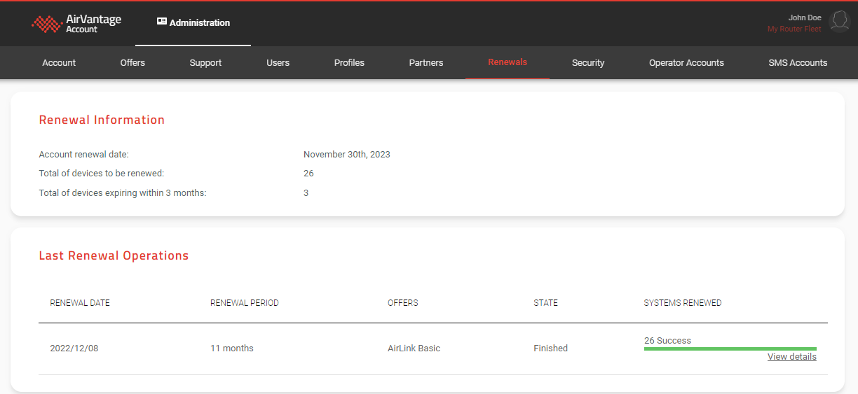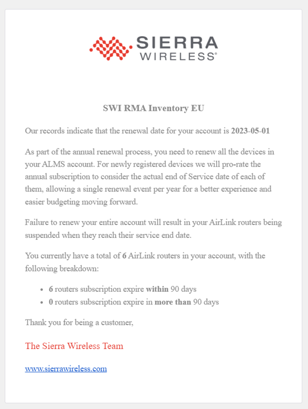 Sierra Wireless will notify your account administrator(s) by email 90 days before the support and warranty dates expire for the first router in your account. Sierra Wireless recommends that you do a full fleet renewal. Please work with your Sierra Wireless Partner or the Sierra Wireless Renewals Team to renew your services and maintain access to your devices on ALMS.