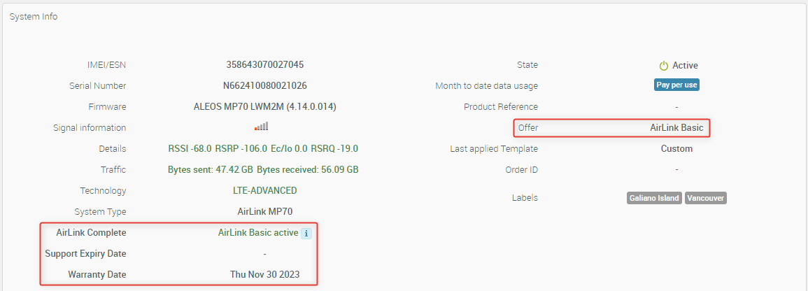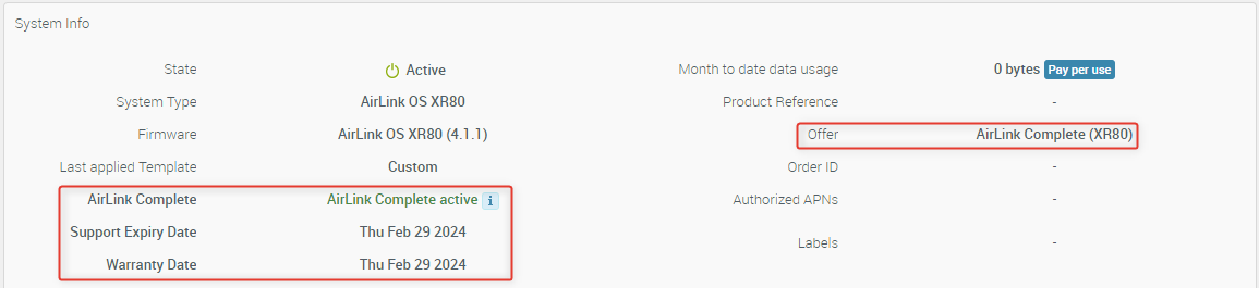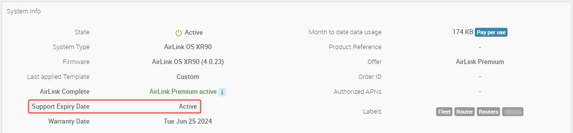 There are four fields that provide the information about the state of services on the device. After you register a new router, the Support Expiry Date and Warranty Date will be identical for the first year of service (both the warranty and Airlink Complete are valid for 1 year from registration). After renewing AirLink Complete, the Support Expiry Date and Warranty Date will update to reflect the renewal period. You can also renew the warranty up to a maximum of five years but access to Customer Support can be renewed indefinitely.
