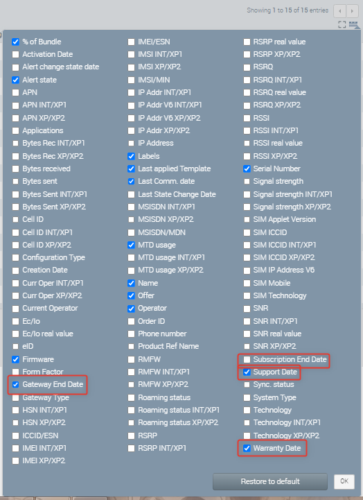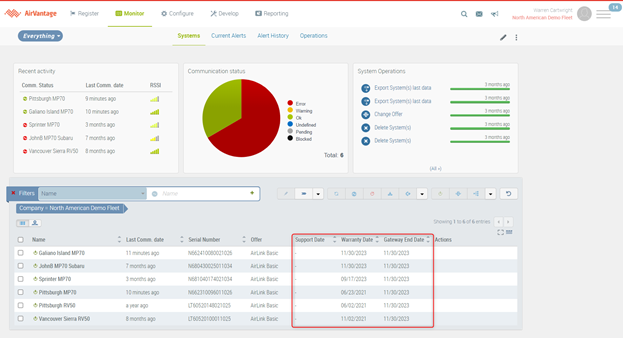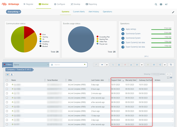 Within the Monitor > Systems Grid, there are four columns that display this information. For ALMS accounts, Support Expiry Date, Warranty Date and Gateway End Date are displayed by default. Subscription End Date is not enabled by default on ALMS accounts, but can be added by users at any time.