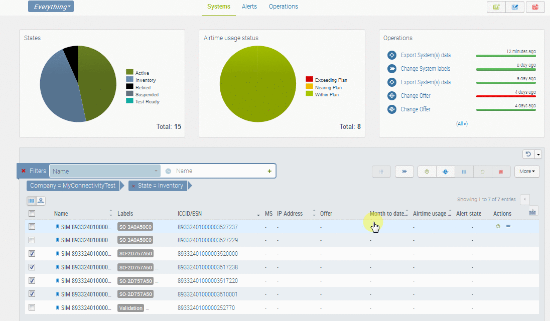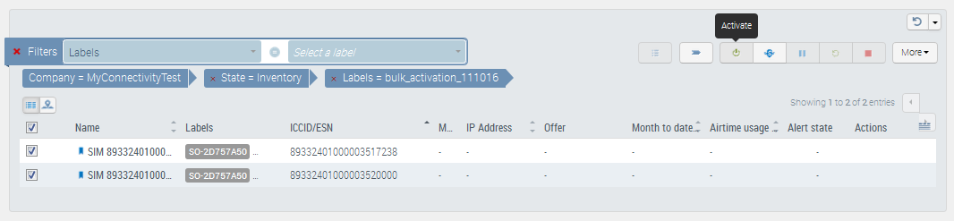 Here we have applied the new Label Filter, you can use the check box at the top left of the list to select all SIMs/systems with the created label. Once done, you are ready, now simply click on Activate!