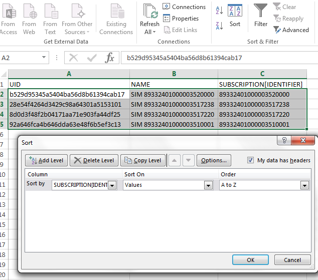 Suppose we now want to Sort this - for instance, on the Subscription ID column. Use the Excel Sort tool.