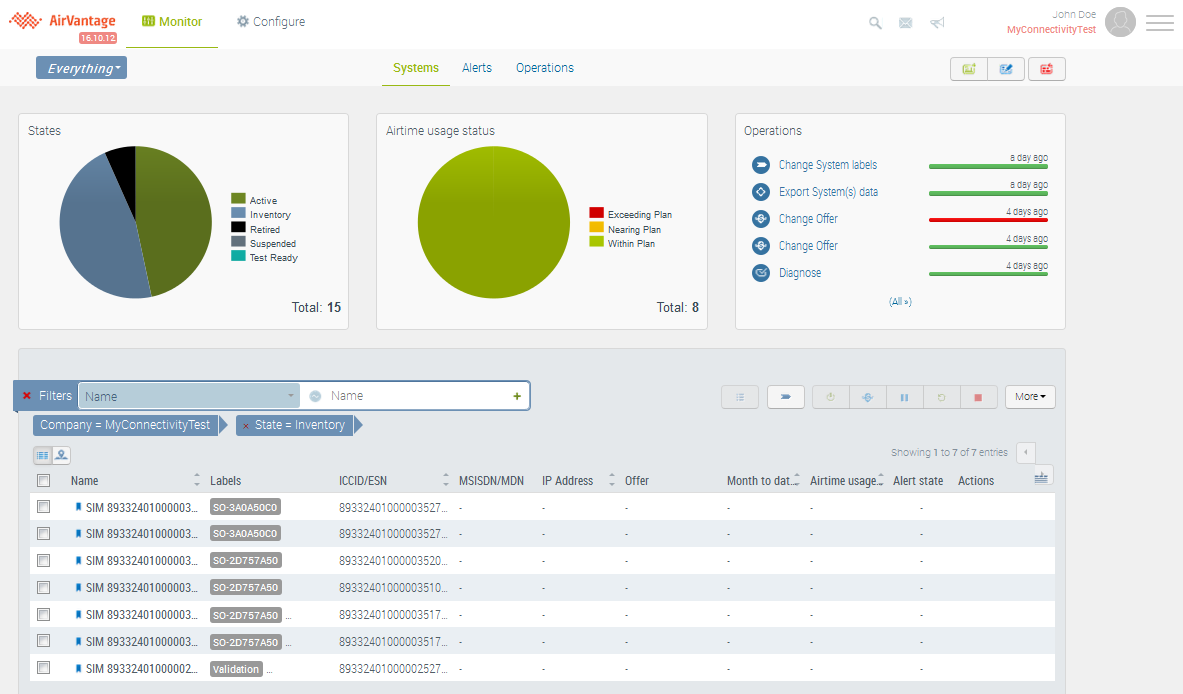 The first useful filter to consider is the State one, as you can only activate SIMs that are in the Inventory state of the lifecycle. To filter the SIM list to show only these SIMS, simply click the Inventory segment on the State chart. This applies a State = Inventory filter, as shown below.