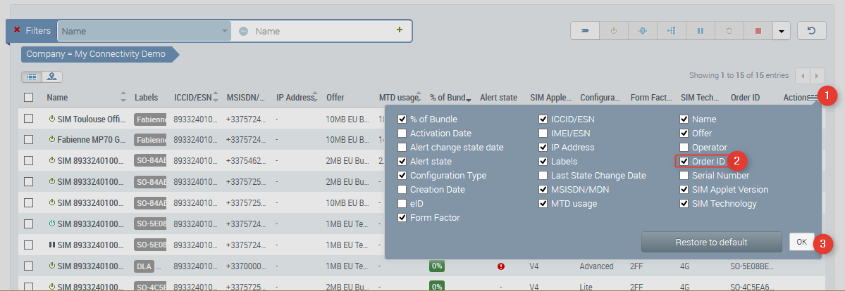 First display the Monitor section of your Connectivity Portal. Use the filter bar, select filter on Order ID and then provide as input the orderID you are looking for. The orderID is starting in ‘SO-’ (SIM Order) and can be displayed by adding the column Order ID to your grid, as shown below:
