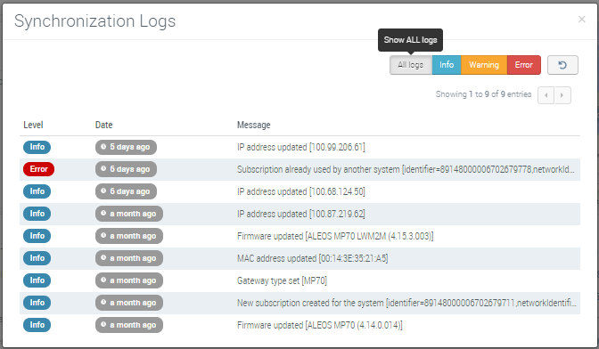 (Info) IP address updated [10.206.166.207] | This Info message is provided if the IP address of the System changes from one check in to the next. This will occur if your SIMs are dynamically addressed and have been updated by your carrier. This is unlikely to affect the performance of your System. |