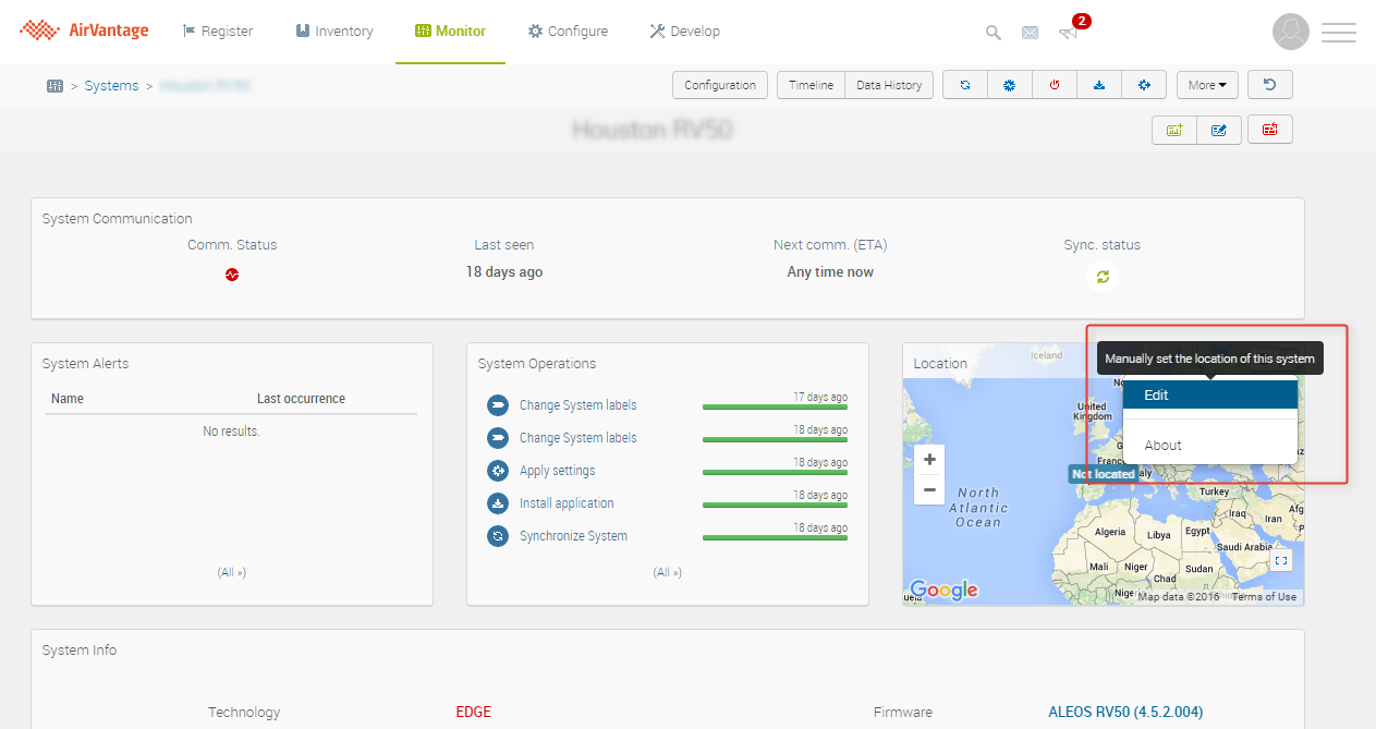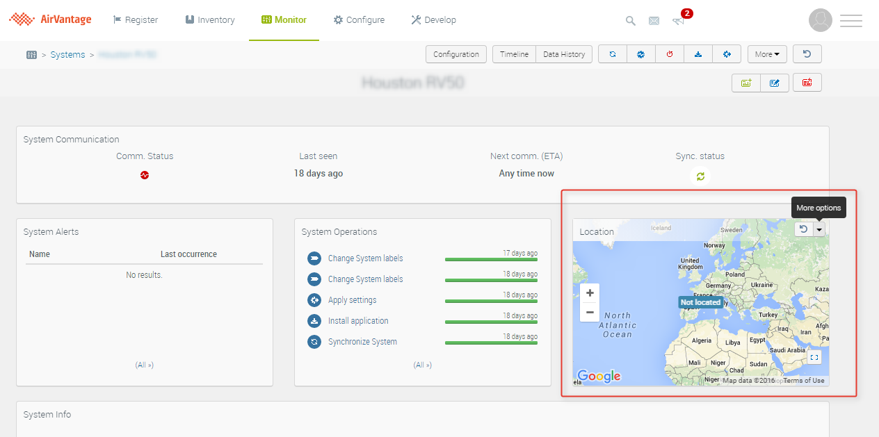 In the Monitor System section, select the gateway you want to update the location for. If the device has never reported a location via GPS, it will likely show a map of the globe, with “Not located” written on the map. Hovering the mouse over the top right hand corner will expose a drop down menu, with hover text “More options”.