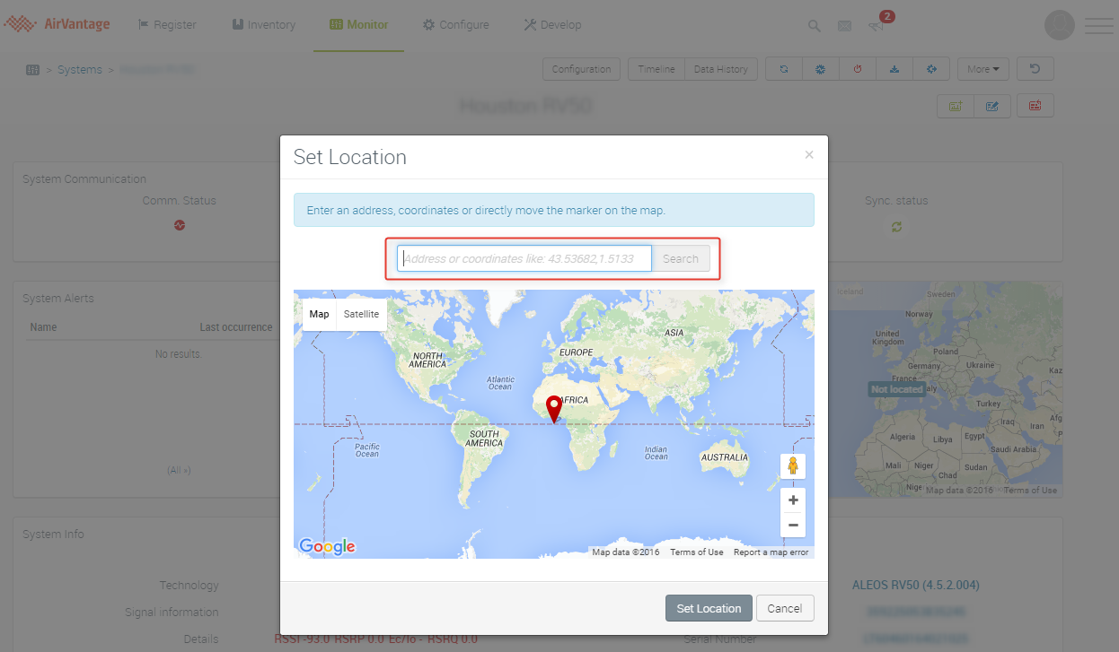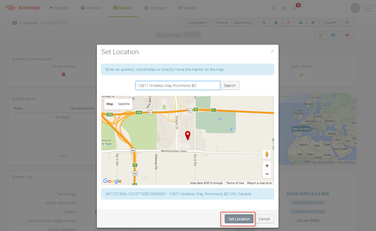 Most AirLink gateways and routers are equipped with GPS receivers, allowing you to track their location in ALMS. While this works most of the time, there are situations where you may have a gateway model that does not have GPS, or your device might not be positioned in a location where you can receive a GPS signal. You may still want to locate the device on the map in ALMS, to allow you to have a wider geographic view of your fleet of devices. ALMS allows you to manually set the location of the system by following the steps below: