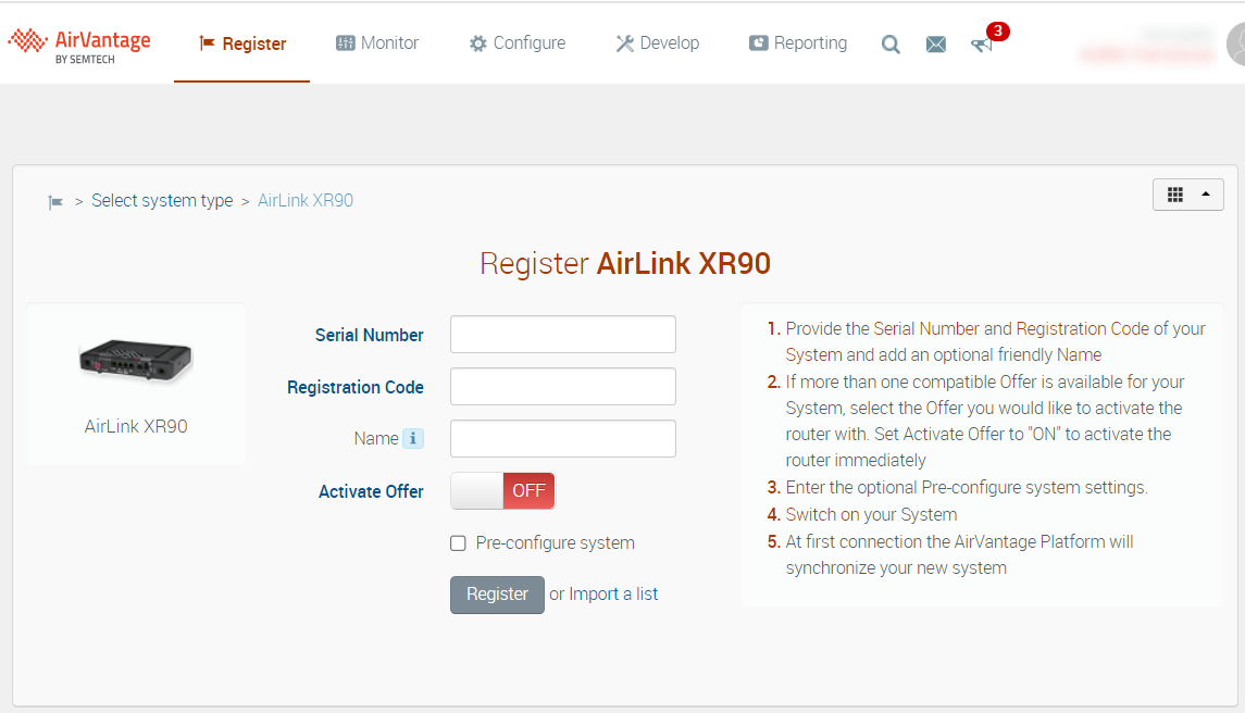Register enables you to easily add and activate new systems into your ALMS account in one easy step. Registering your AirLink routers on ALMS is a best practice, whether you plan to use ALMS or not. This simple step provides visibility and notification on your services and warranty dates, confirms you’re the rightful owner of the router, gives you access to technical support, and helps you stay one step ahead of potential threats.