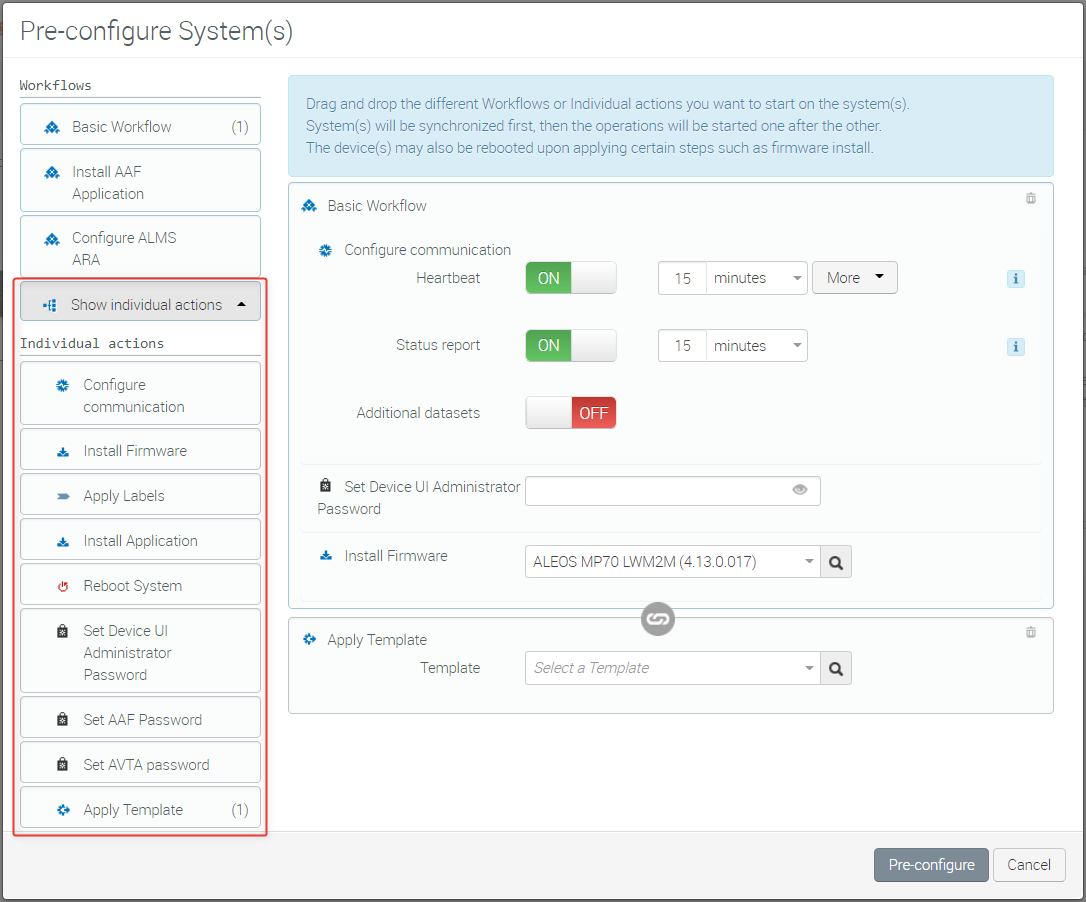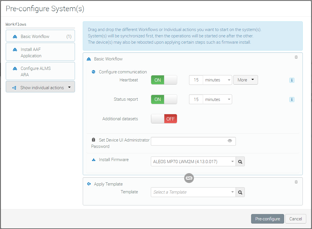 To simplify your deployment you can pre-designate the configuration you want AirVantage to apply when it connects the first time. The Pre-configure System(s) window offers several pre-defined workflows for pre-configuration.