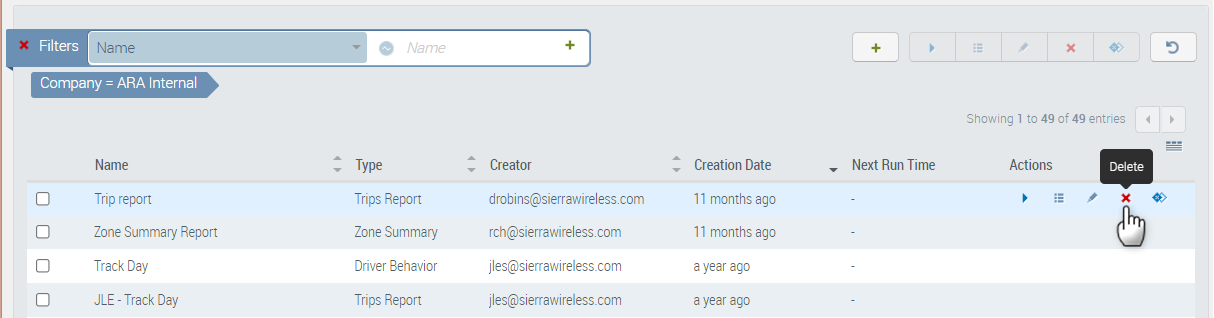 You can also perform actions (such as Delete) for a specific instance of a report in the Actions column, as shown below.