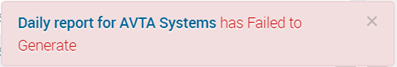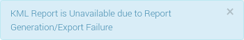 If you click an export file format icon, an error message appears if the file cannot be downloaded in the enabled formats (such as PDF/CSV/KML) because of a file export generation failure, timeout, cancellation, or report processing error. The example on the right shows a KML report generation/export error. Note that when a file export generation failure occurs (the report status is orange), you can still view the report in your browser, as described in Viewing Reports below.