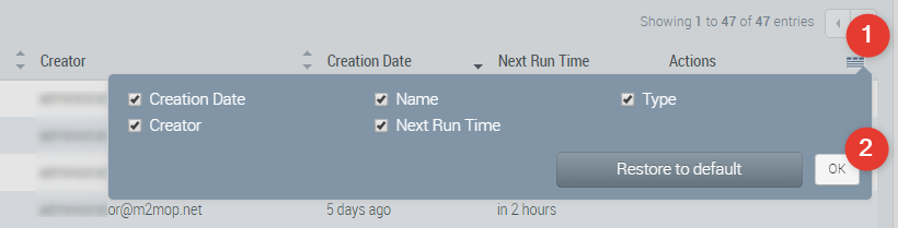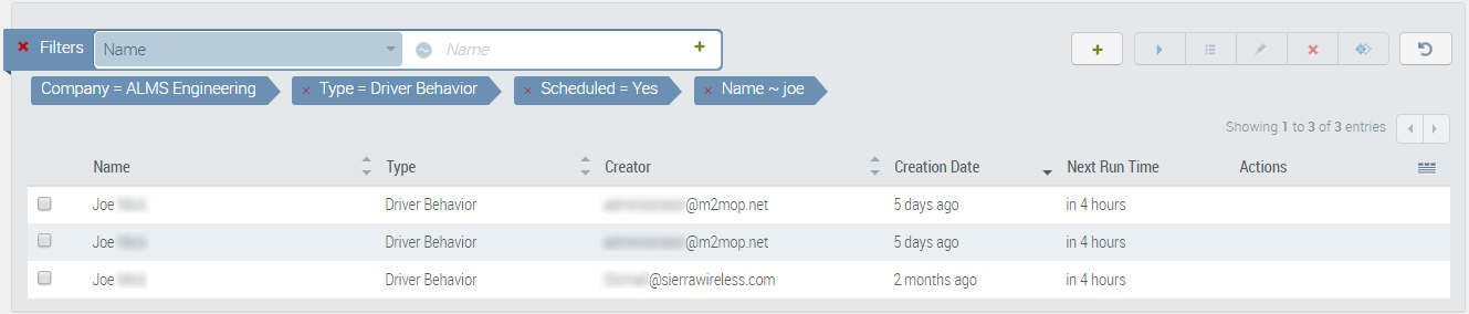 Finding a report or group of reports of interest is easy using filters. Filters can be applied for single or multiple variables: filter on report type, report name, creator, or scheduled (yes/no).