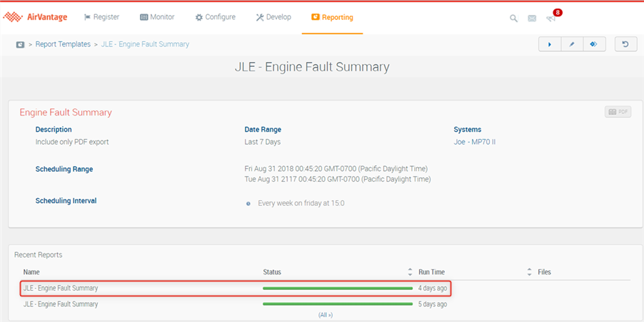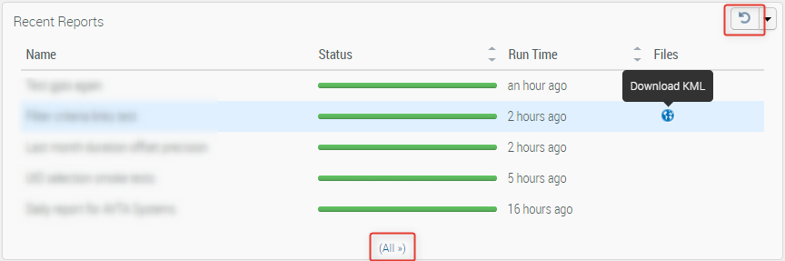 The Recent Reports widget shows you the last five reports that were run, along with their status and time of completion.