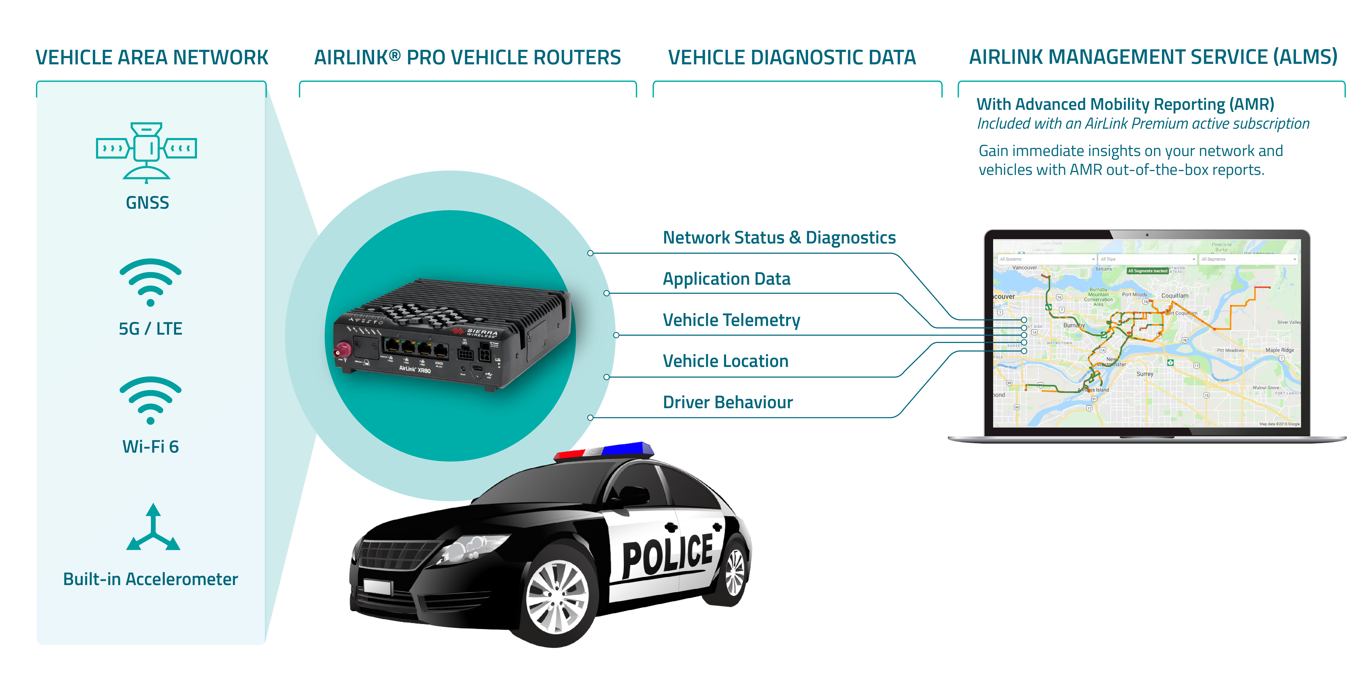 The AirLink MP70 router, with its vehicle telemetry capability and inertial sensors, supports all features of AMR.