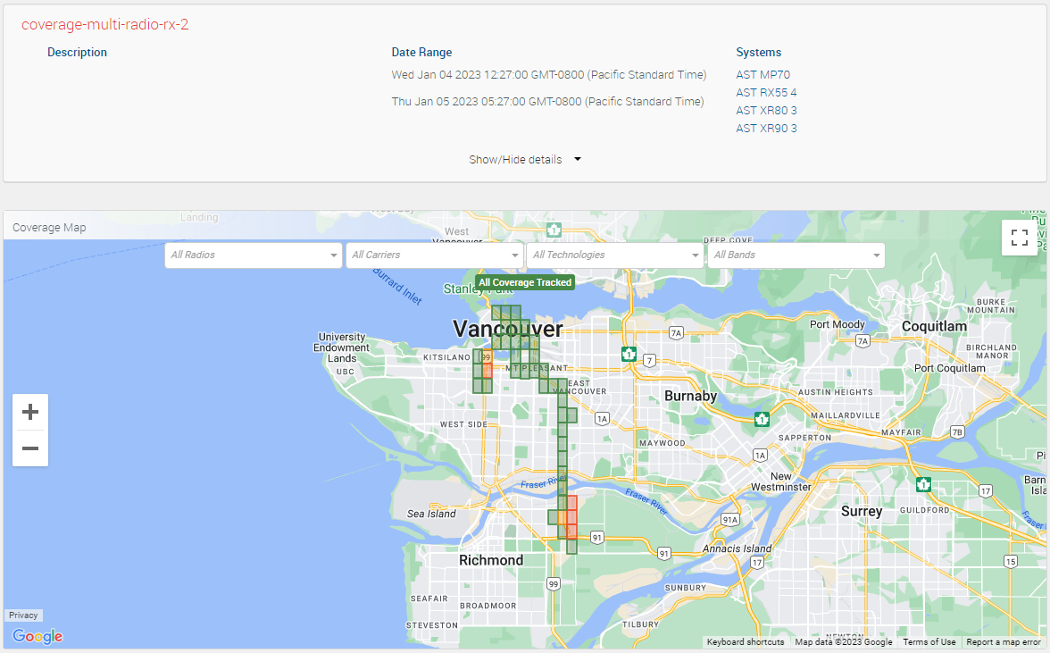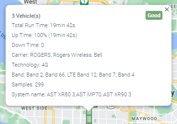 The Coverage Map report shows you system network connectivity status during trips within the reporting period. The Coverage Map consists of squares shaded green (good), amber (average) or red (poor) based on the percentage of cellular uptime during the trip segment. You can use this report to identify regions that may have connectivity quality-of-service issues.