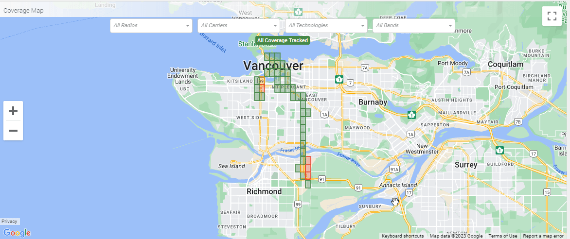 You can view results for various radios, carriers, cellular technologies and radio bands by selecting from the lists at the top of the map.