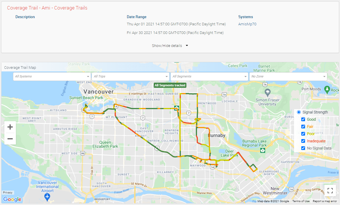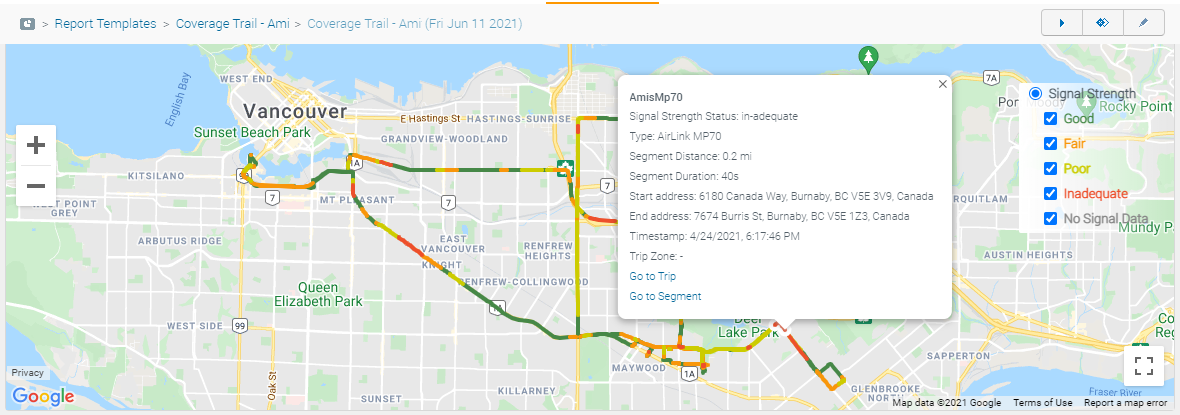 The Coverage Trails report shows you the specific connectivity status during trips within the reporting period. The Coverage Trail provides a colour-coded trail based on the signal strength recorded for the active cellular interface (including an external modem/HPUE interface, if connected). You can use this report to identify regions that may have connectivity quality-of-service issues.