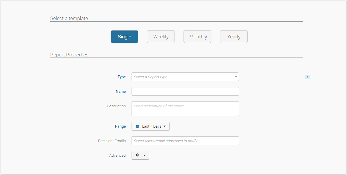 Click the Advanced button to display options for selecting start and end dates for your reports. For example, you can configure a weekly report to run for two months starting one week from today.
