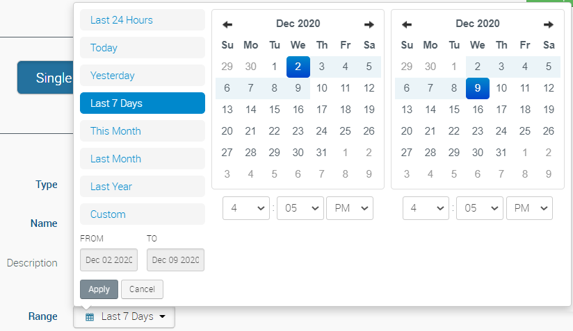 If you click Custom, a calendar appears, allowing you to select a start date/time and an end date/time for your report.
