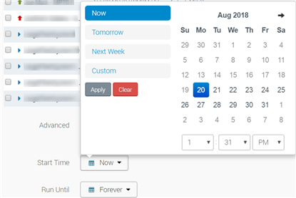 Clicking Start Time or Run Until displays a calendar on which you can define a start date/time and end date/time.