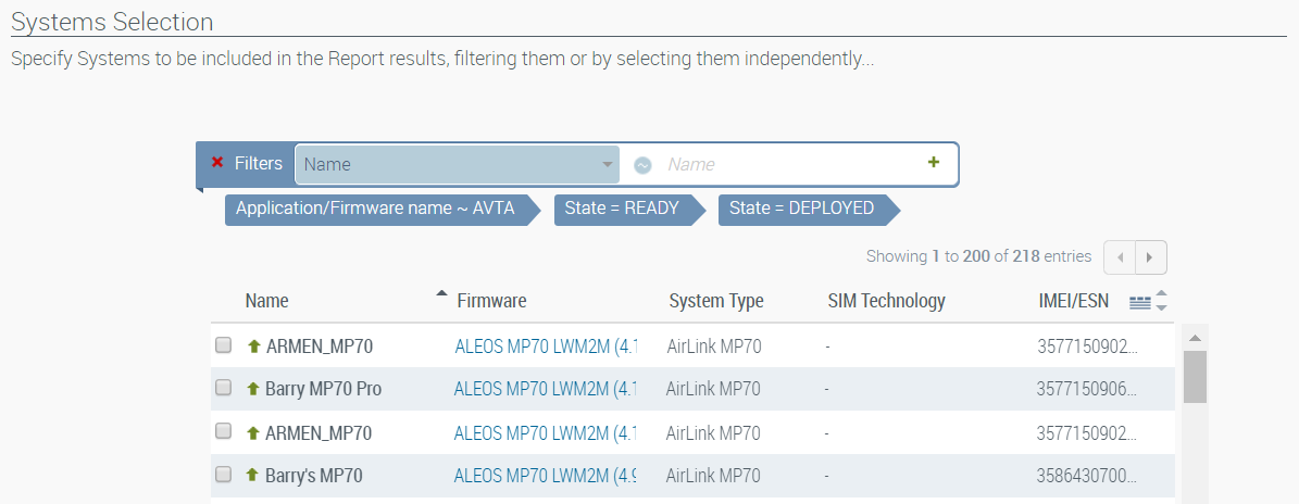 The system list is automatically filtered to display systems that are running AVTA and are in the READY and DEPLOYED state. Reports will not run if no valid systems are available.