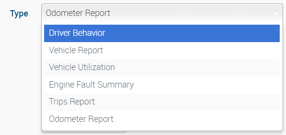 The Type menu lists the available report types. Some of the report fields and other settings will vary according to the type of report you select. For more information, see Driver Behavior reports , Vehicle reports , Vehicle Utilization reports , Engine Fault Summary reports , Trips reports , Odometer reports , Seat Belt reports , Zone Summary reports , and Trip Replay .