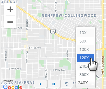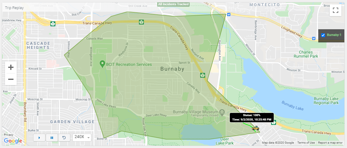 Start, pause, replay, replay speed and map zoom controls give you options for viewing trip replays.