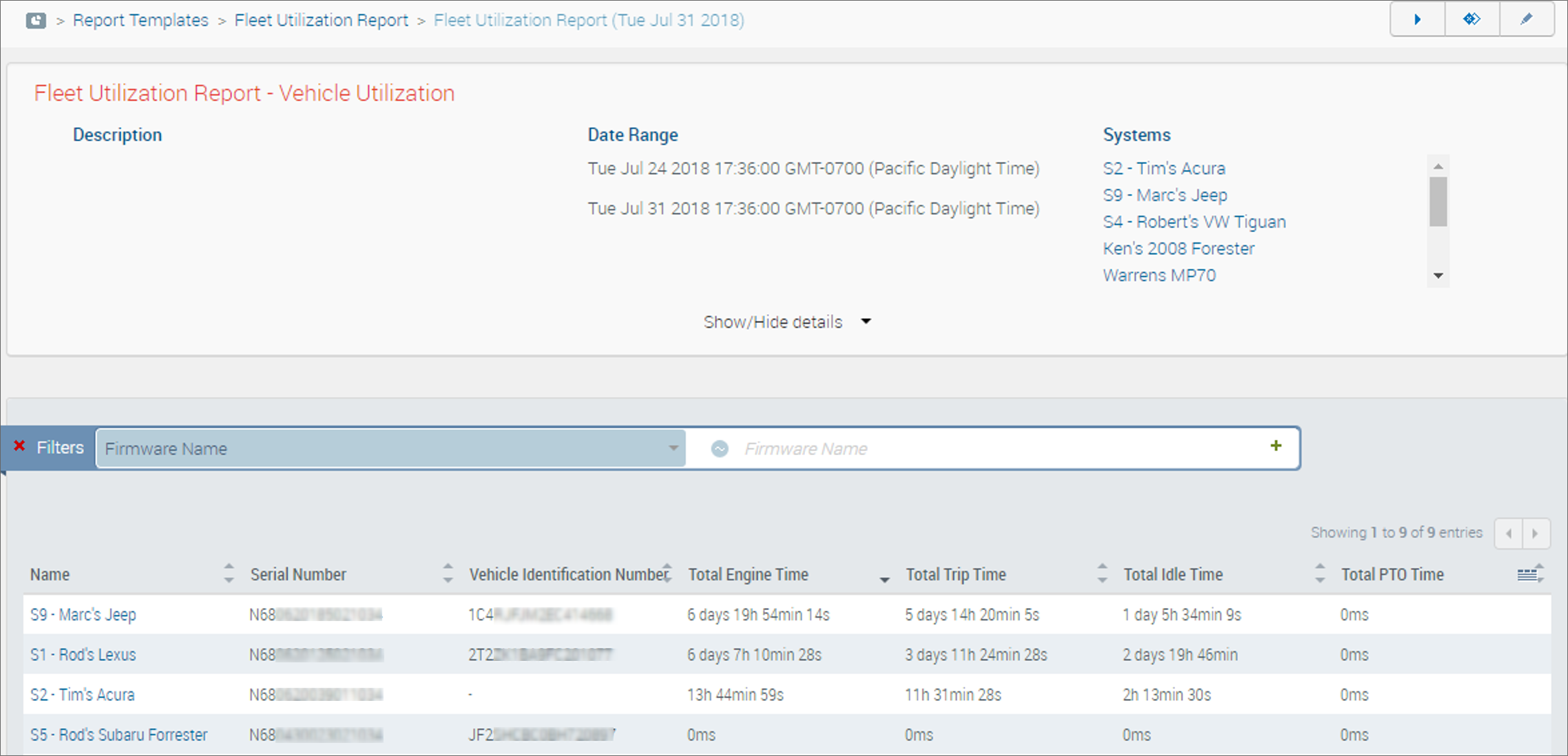 The Vehicle Utilization report provides a high-level overview of vehicle use for the vehicle that the AirLink device is installed in, linking the device serial number with the vehicle’s Vehicle Identification Number (VIN).
