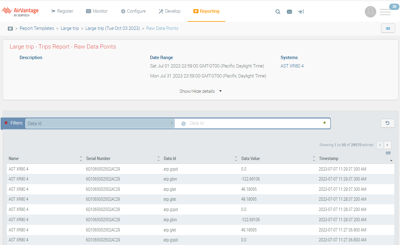 You can view and download the raw data points used to generate the report. This allows you and the Sierra Wireless Support team to more easily analyze and possibly troubleshoot AMR reports.