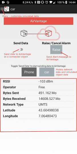 Turn on the “Send data…” switch to start sending data from your phone to AirVantage periodically. You can leave the app running in the background, it will continue sending data.