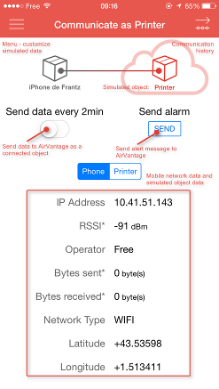 AV Phone is a mobile application, it sends data to AirVantage as a simulated object. By default, the app simulates a connected printer that sends mobile network data and simulated printing operations data to AirVantage periodically.