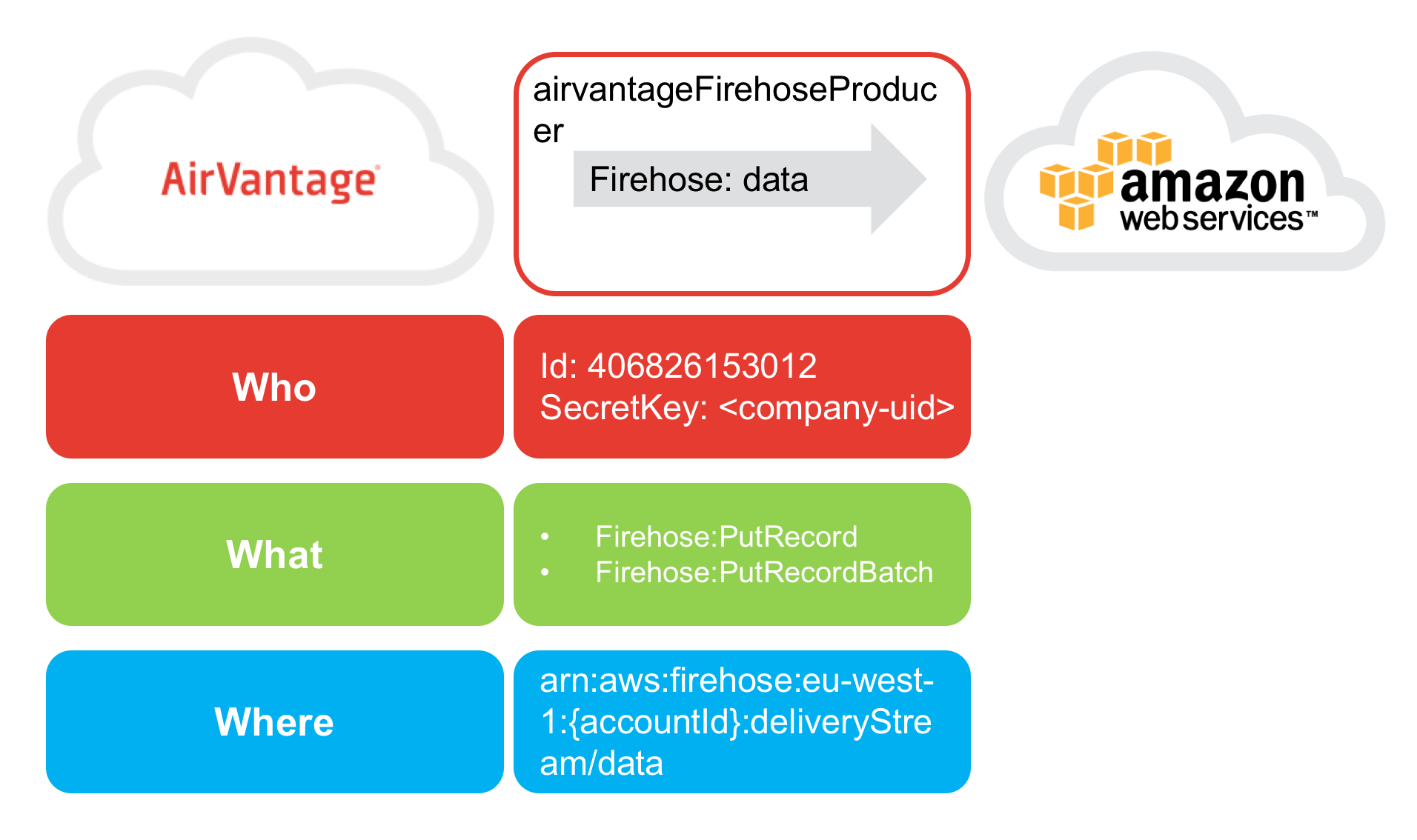 In the schema on the right, we created an airvantageKinesisProducer role applied to an AirVantage AWS account for a given company defined by the company uid in the SecretKey.