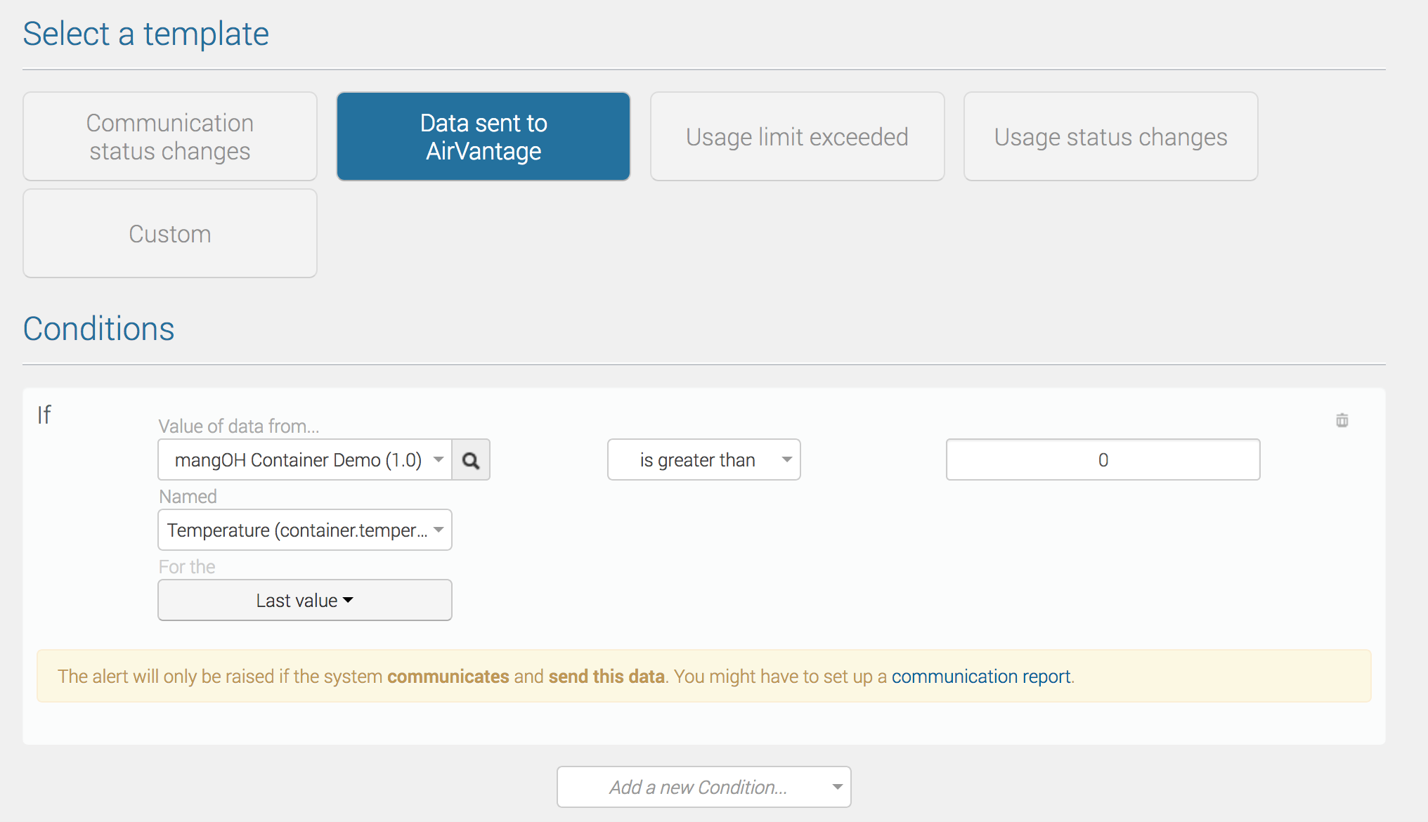 In order to simplify the creation of a rule, a set of templates is available to focus on what you want to monitor. If you want to use any of the available data and operator, choose Custom